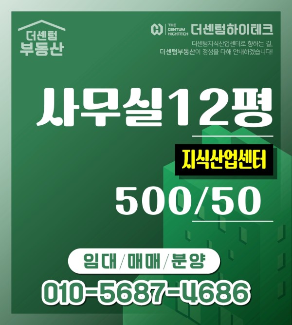 더센텀하이테크(지식산업센터)사무실 · 착한가격 쾌적한업무환경 뷰와 주차최상 · 12평 (약 39.67 ㎡) · 임대500 / 50 / 매매0